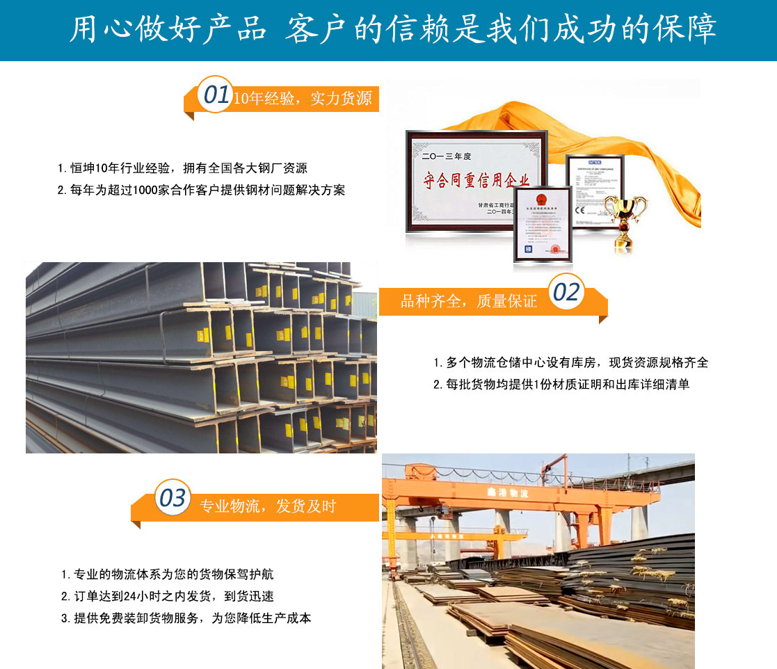 蘭州恒坤商貿(mào)有限公司立足于鋼材貿(mào)易,主要經(jīng)營:鋼板、角鋼、工字鋼、槽鋼、H型鋼、鍍鋅槽鋼、鍍鋅角鋼、鍍鋅板、鍍鋅卷、鍍鋅圓鋼、鍍鋅工字鋼多種型號鋼材產(chǎn)品。多年來,我公司始終堅持質(zhì)量第一,信譽至上的經(jīng)營方針,與酒鋼、包鋼、八鋼、唐鋼、鞍鋼、萊鋼、兗礦、日照鋼鐵、濟鋼,成都、天津等多家企業(yè)達成大批量物資供應(yīng)協(xié)議,并且與省內(nèi)外多家客戶建立了合作關(guān)系。